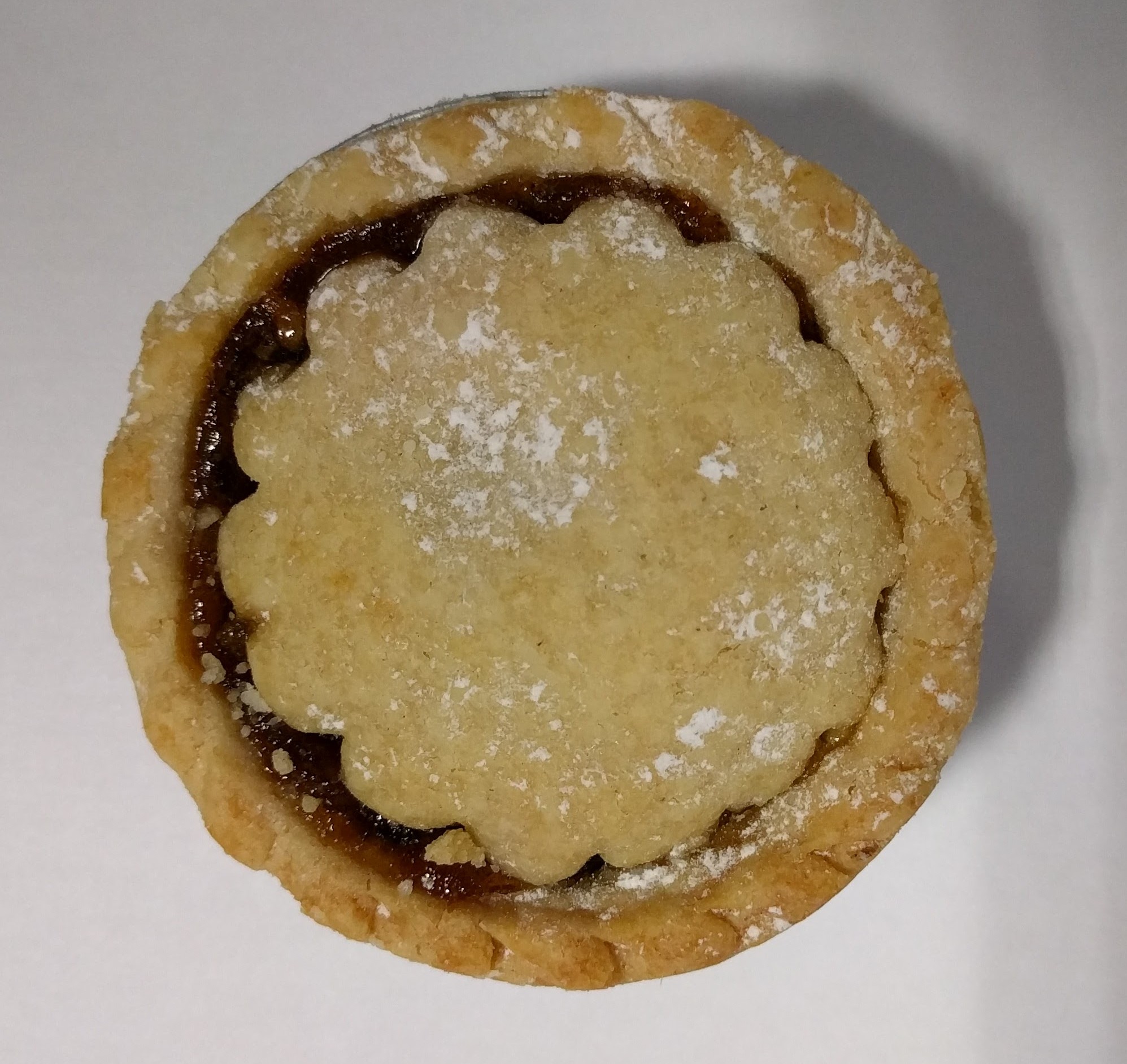 A rather nice looking pie, each one different and unique with a real 'home made' feel and a light sprinkling of icing sugar. It's a very good size pie to, and feels heavy in the hand so it must be full of mincemeat, we can see it seeping out from under the lid.