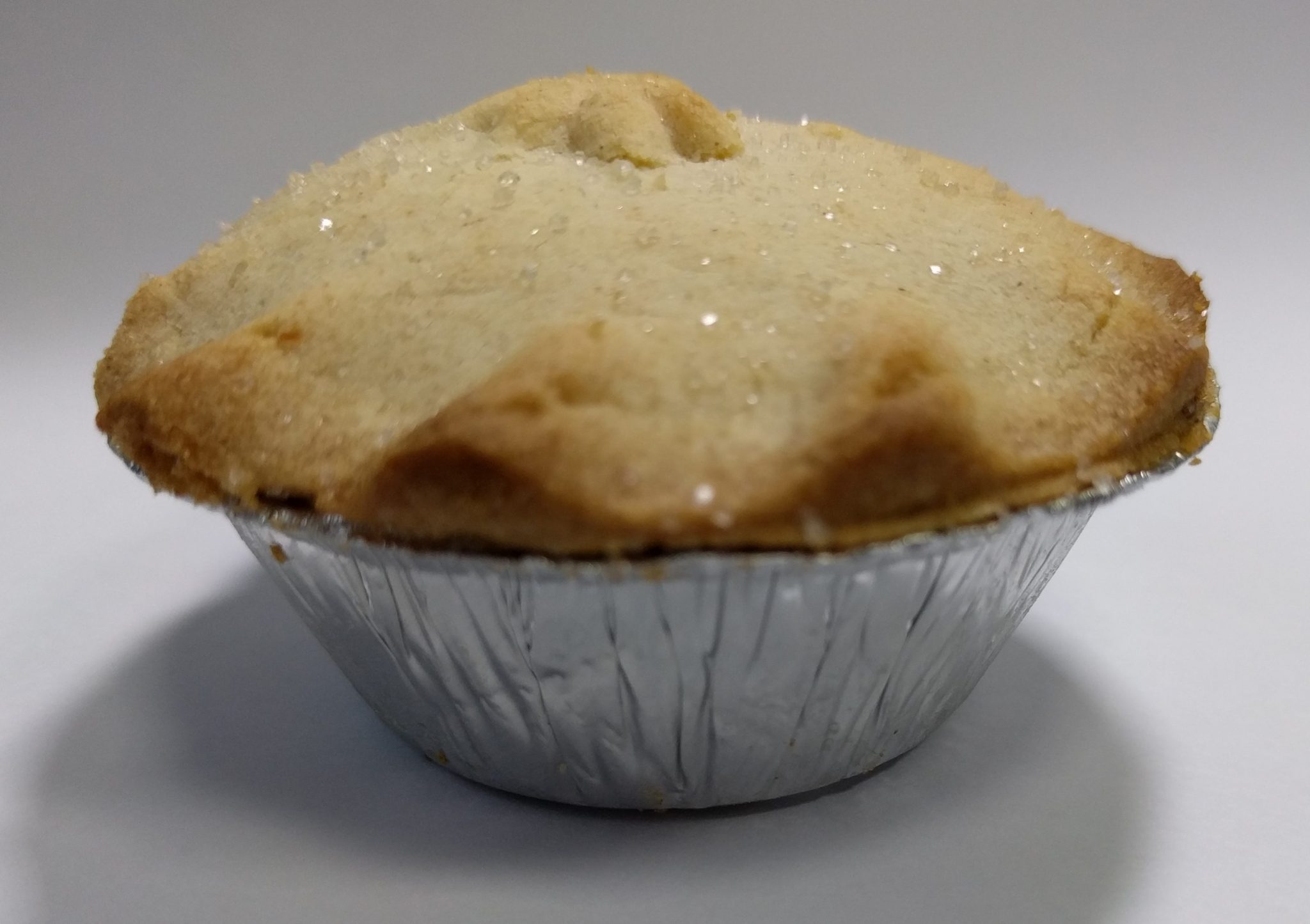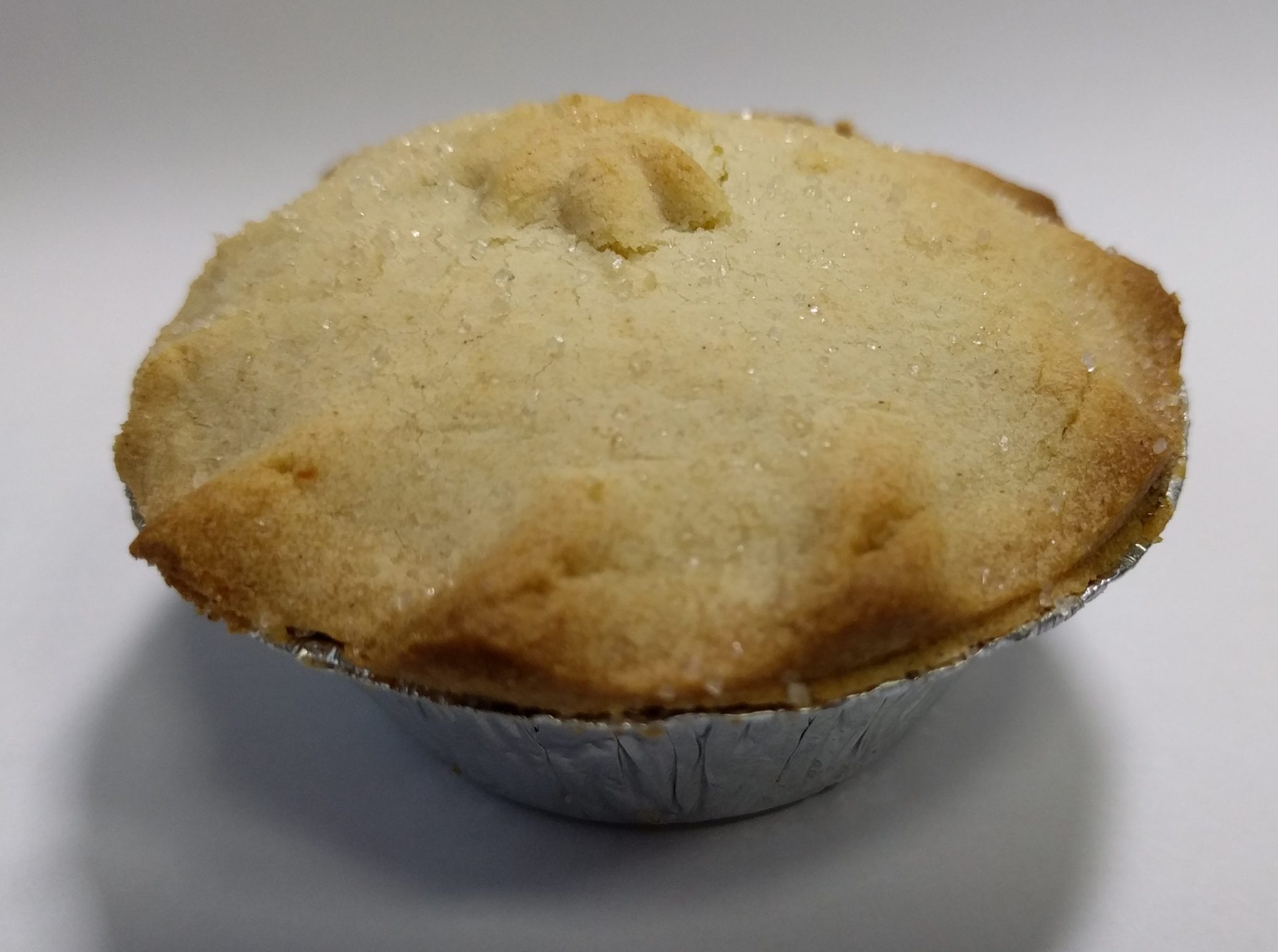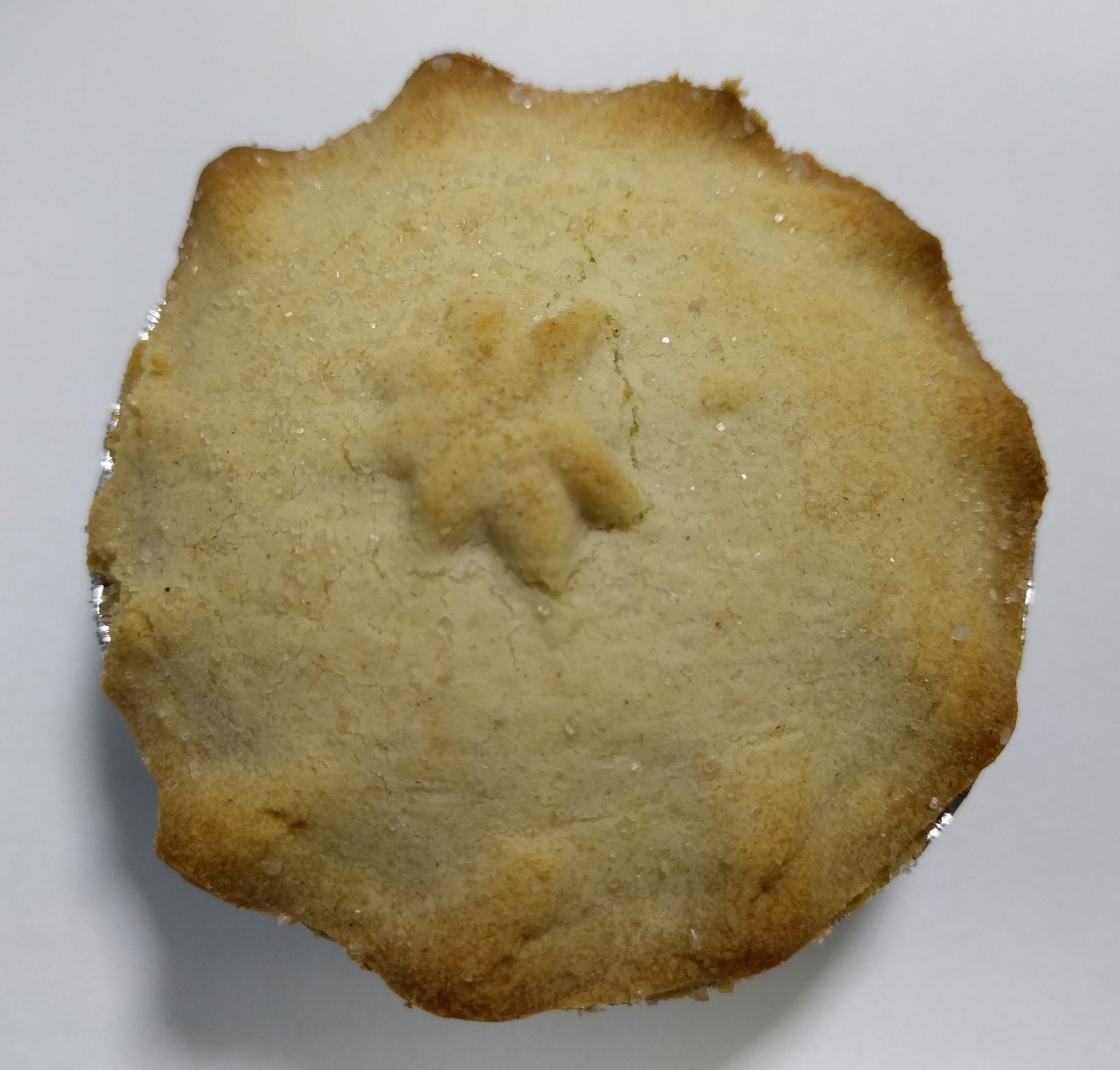 Today we are back to a much more conventional Mince Pie. A typical 'standard' sized pie it's only distinguishing feature being the Star? design on the top. There is possibly a coating of granulated sugar, but it's a bit hard to tell. The lid is quite domed, could it be full of filling? Or Air...First impressions were good, pastry was just about right, soft but not too crumbly. Filling was sweet with defiant fruit texture.... but oh dear it's was barely half full and all the dome was full of air, what a shame.In conclusion, an average pie, good in a few areas but none of them outstanding. Let down by cost cutting. With a more generous coating of sugar and filling of mincemeat it could have been a great pie. Instead just average.