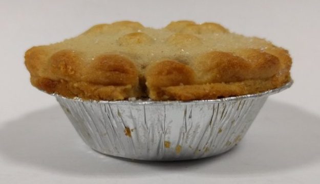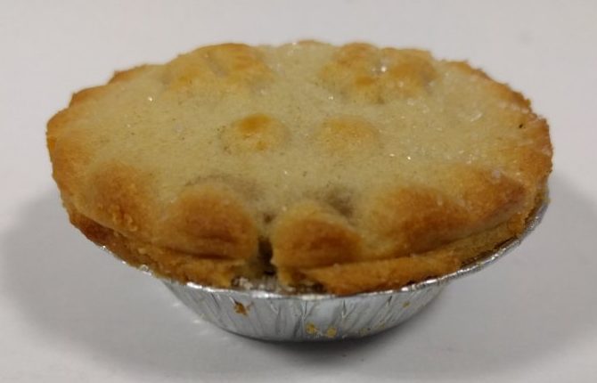 Another nice looking pie today, the holly leaf design and sugar coating are very festive. The pie came cleanly out of it's case but didn't feel very heavy for it's average size. First impressions were good, pastry was soft and not too crumbly. Some texture and fruit in the filling, nice. However, my pie was only half full. I've been robbed! If only there had been more filling....