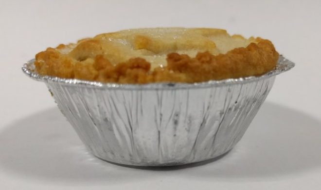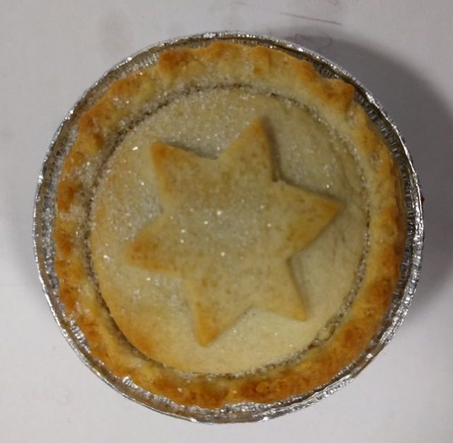 Today's pie is slightly on the small side. The large star design only half covered with sugar. The top is slightly bulging, could this pie be full to the brim with filling... First impressions were OK. The pastry was slightly dry but acceptable it held together well and did not fall apart. Another sweet pie, and yes loads of filling. There was some texture and fruit in there too. Good effort shame it was on the small side.