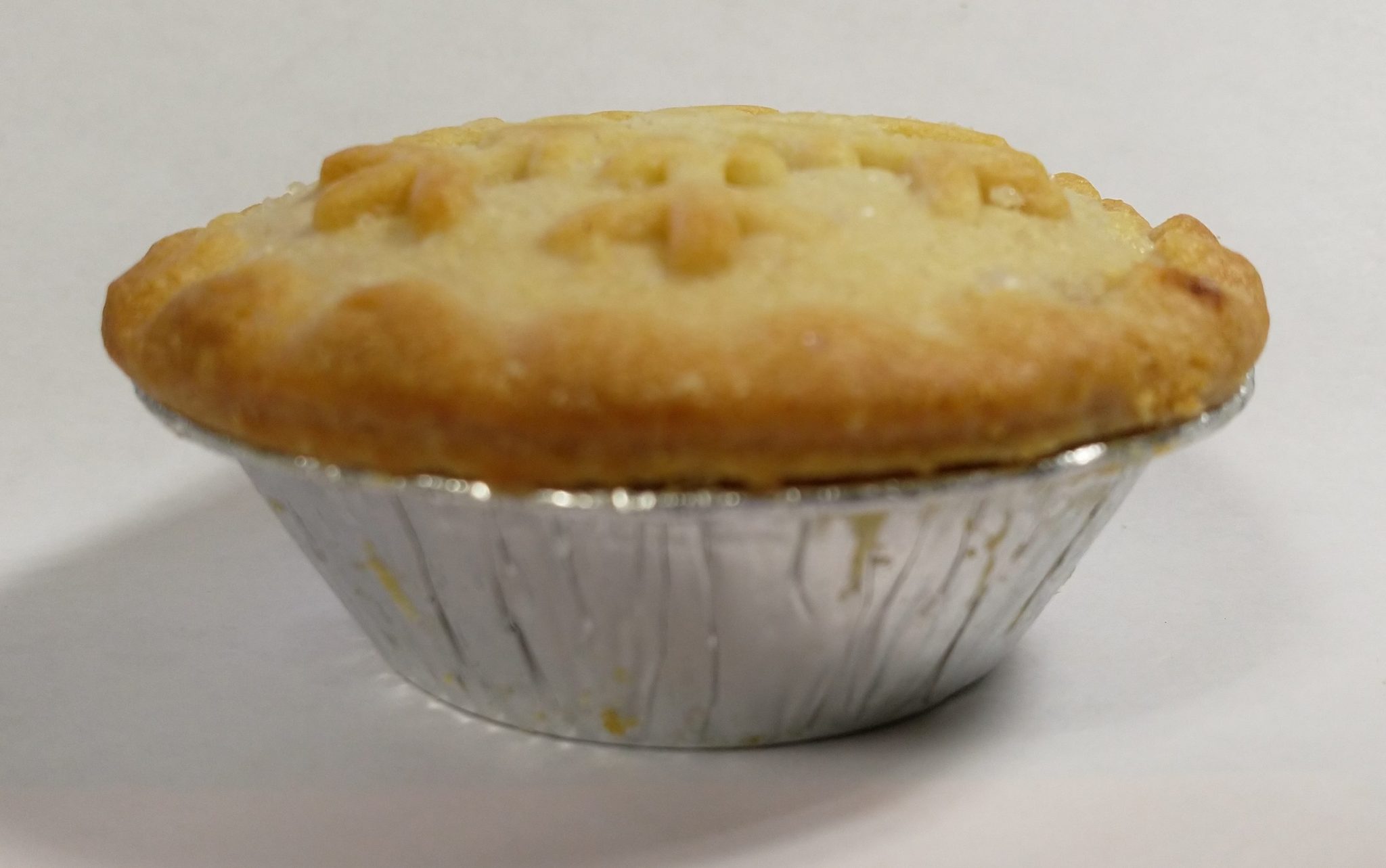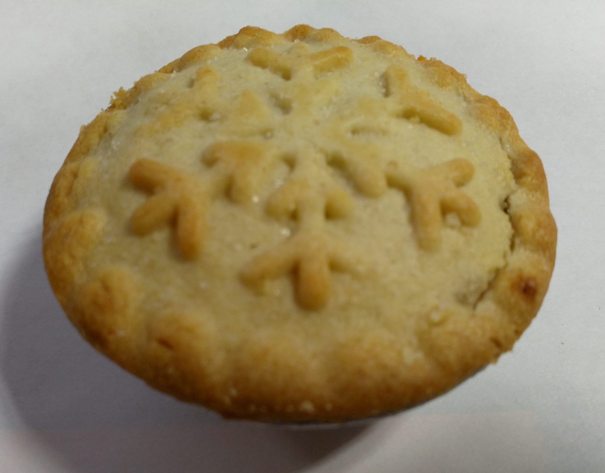 This year we have a new box design, and a new pie top design, let's hope that the inside of the pie has been improved to the same level. The new snowflake top design reminds ups of a Tesco Finest pie, it covers the lid nicely. Our pie had a distinct lack of sugar coating, though the pastry did glisten in the light. The pie was a good size and weight in the hand, it came out of it's pastry case with ease.