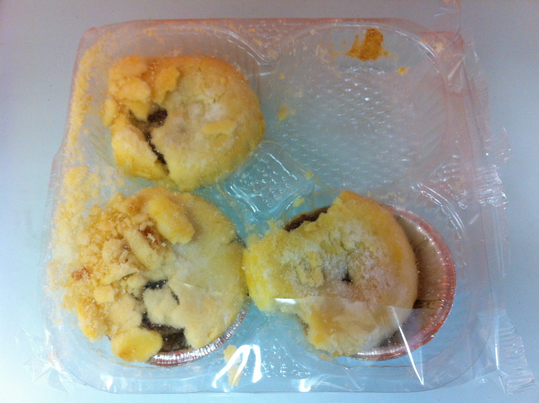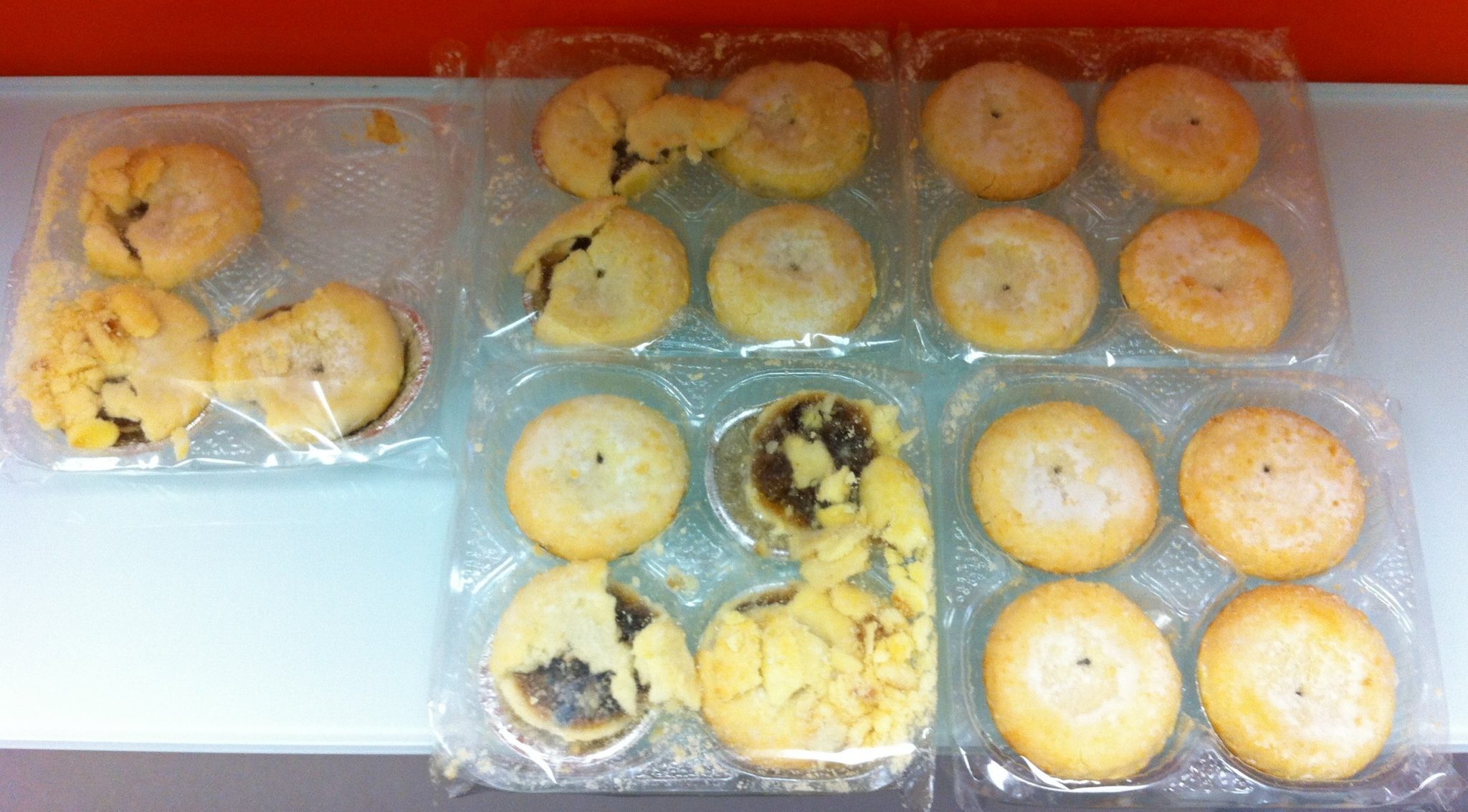 “The smell reminded me too much of vinegar, which i am not a fan off, so unfortunately this pie did not get off to a good start. The very dry, and too crumbly pastry did not add to the already not-so-good first impression. Quite liked the use of powdered sugar, instead of traditional granulated. Really liked the filling – just the right amount of sugar, smooth but also chunky, with a mice mix of fruit flavours, but owing to the shape of the pie, not enough of it! The sugar coating suggest some kind of wannabe-premium brand… Tesco Finest?”