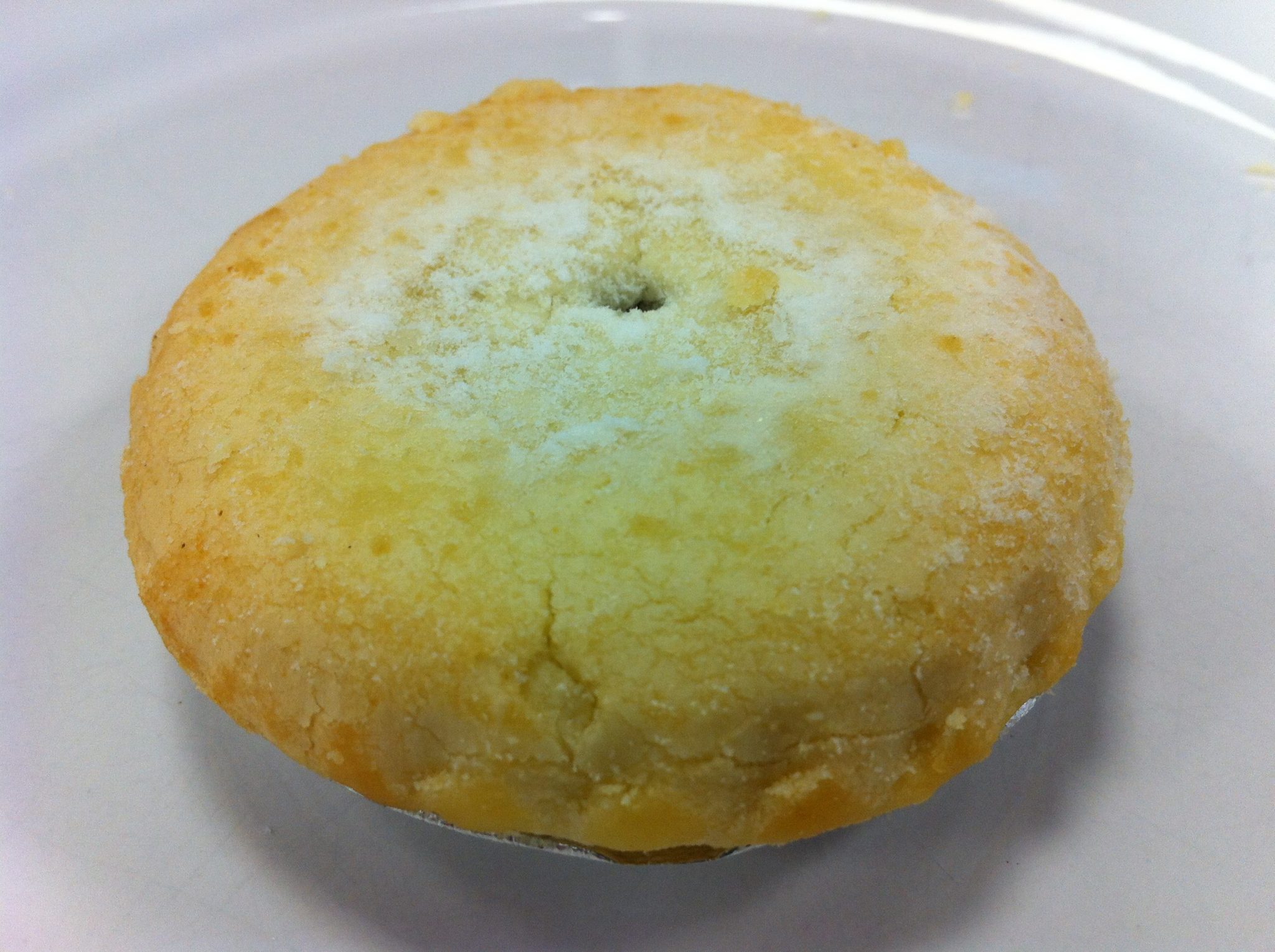 “Ooh, a different looking pie! I normally like buttery shortbread type pastry but this offering with apparently very little butter content and therefore a much ‘shorter’ crumb, was very nice. It smelt great. Quite small, though, and nothing special to the filling, and I prefer a granulated sugar top to icing sugar. I’d guess a specialist bakery because it doesn’t look like the mass produced stuff from supermarkets.”