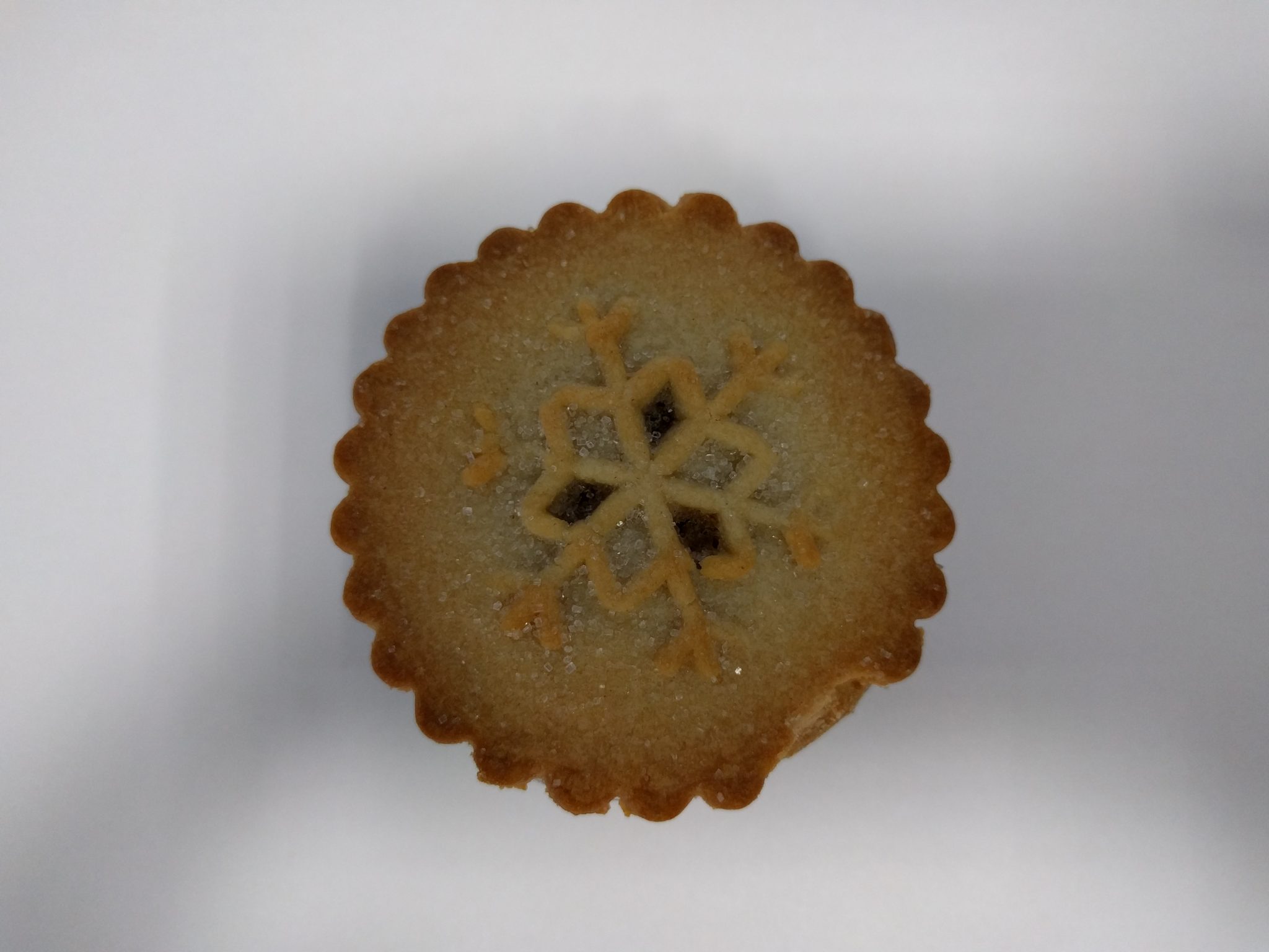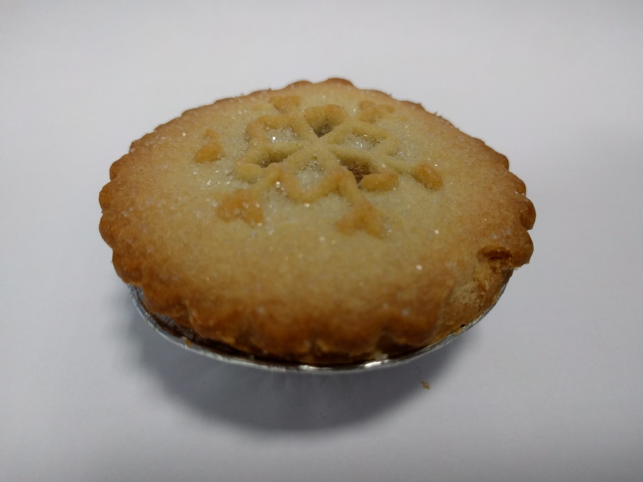 A lovely looking Mince Pie nice design with a generous sprinkle of granulated sugar. An average size pie, but a good weight so there must be plenty of filling inside. First impressions were good, soft pastry, not too crumbly. Plenty of filling that you could taste the fruit. Overall a very nice pie.